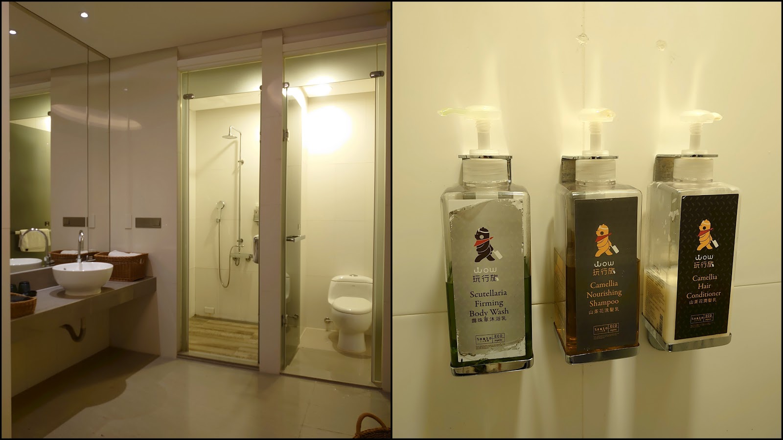 乾溼分離的衛浴設備 連上廁所跟盥洗 (花灑式) 也分隔開來 [左] 天啊,連沐浴乳、洗髮乳等備品 [右] 也秀出自家超可愛的 Logo 呢 ~ |