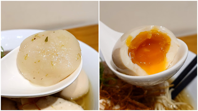 【檸香干貝 [左] NT. 50 ~ 大推】 與 【溏心蛋 [右] NT. 30 ~ 大推】 都是額外加點的,拉麵本身不含 但其好吃程度足列為必點等級 柔嫩滑細、渾圓體碩的干貝 鮮度當真是無可挑剔 一口咬下感受到奶香來襲 再略以刨絲的檸檬皮提味 更顯清新高雅 半融溏心蛋的濕滑度一級棒 尤其是蛋黃部位嚐來醇郁膏潤 蛋白則彈滑細膩,完全讓人欲罷不能 |